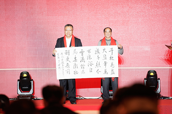 荀德麟为“大淮”现场赋诗一首,并讲述淮安作为“运河之都”的人文历史和酒缘文化的传承。他表示,今世缘·大淮酒,像一面情感的旗帜、一根乡情的“热线”,召唤着淮安人的身份认同,传递着淮安人的乡愁慰藉,点燃了淮安人的归属荣光,是对焕发青春的“南船北马”交通枢纽的崇高致敬;是对“运河之都”历史辉煌的诗意铺陈。